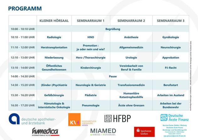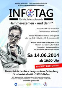 Auch dieses Jahr findet wieder der Infotag für Medizinstudierende statt. Am 14. Juni 2014 ab 10:00 Uhr (Einlass ab 9:45 Uhr) im Biomedizinischen Forschungszentrum Seltersberg (BFS) in der Schubertstraße 81 erwarten euch interessante Vorträge neben den meisten Fachrichtungen auch über Approbation, Promotion oder alternative Berufschancen.
